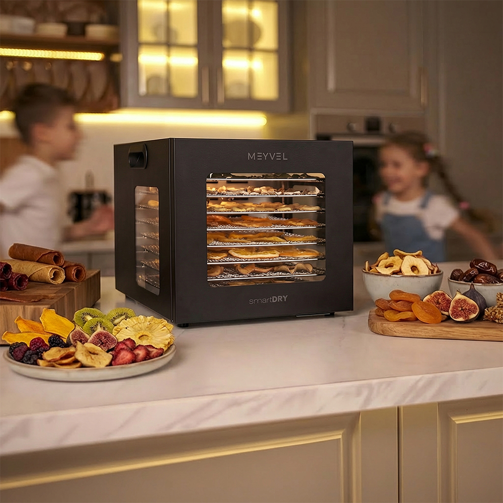 Meyvel MDH8-1S (Black) — это современный дегидратор, который создан для тех, кто хочет заготавливать фрукты, овощи, мясо, травы и ягоды без потери их вкуса и пользы круглый год. Прочный корпус, продуманная конструкция и умная электроника превращают его в надёжного помощника на каждый сезон.