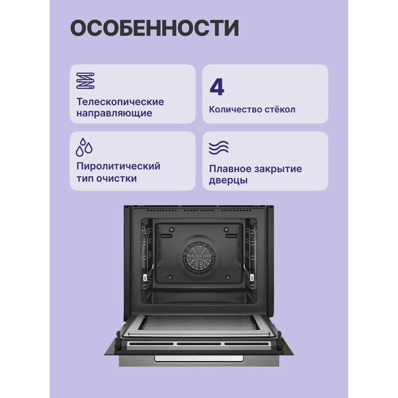 Сенсорное управление делает выбор режима и настройки простыми и интуитивно понятными. Четырёхслойное остекление дверцы духового шкафа не только придаёт ему стильный вид, но и обеспечивает надежную теплоизоляцию, минимизируя риск обжигания. LED-освещение полностью освещает внутреннее пространство, позволяя вам следить за процессом приготовления без необходимости открывать дверцу. Пиролитическая самоочистка — это еще одно важное преимущество, позволяющее легко поддерживать духовой шкаф в идеальном состоянии. При этом телескопические направляющие можно не снимать во время пиролиза, что делает процесс еще более удобным.